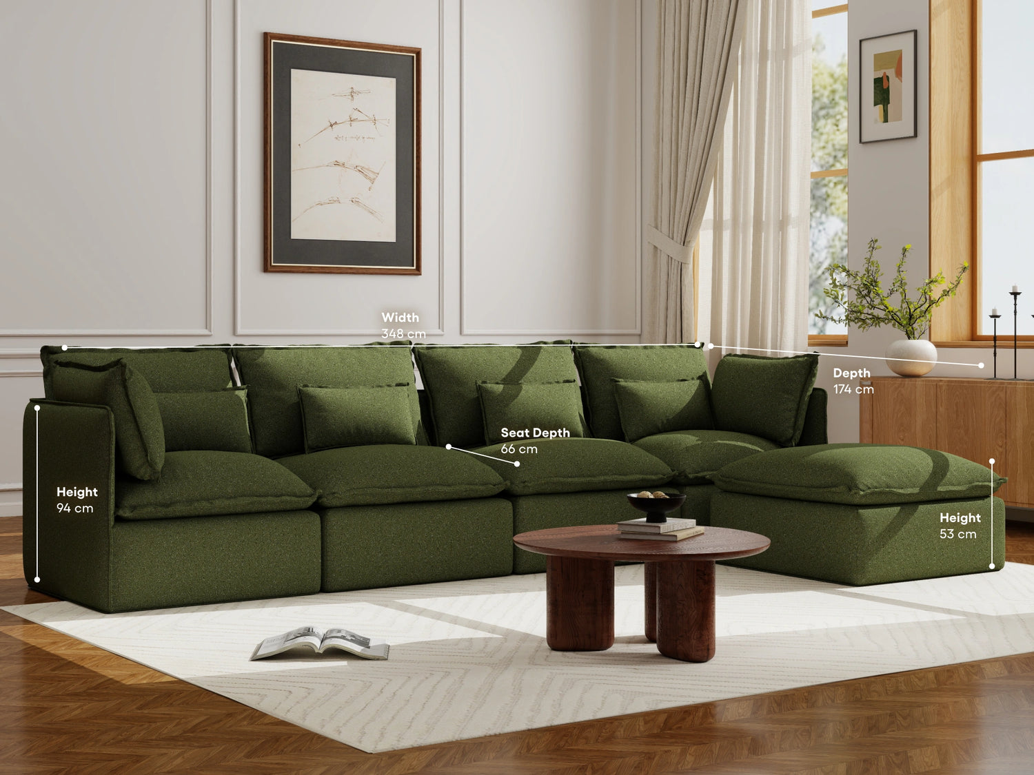 I originally got the 4 seater, I’ve since added two more seats and 2 ottomans. I have 2 toddlers and a dog (and a tradie) AND the white version and I am super impressed with the way it spot cleans. I’ve gotten pen, raspberry and chocolate off without having to wash it in the machine. The pillows get softer everytime we sit on it and it’s firm enough that it has decent support in the back. I hope they bring out more colours! Maybe boucle grey?? Or a chocolate! It has not disappointed me yet!
