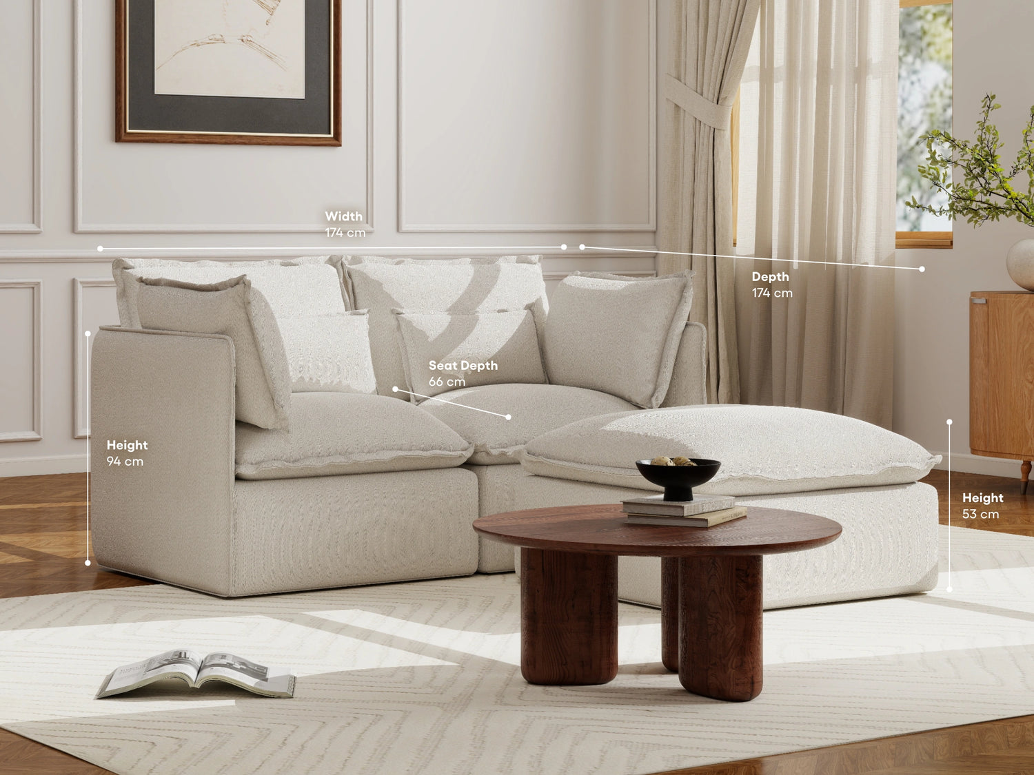 I originally got the 4 seater, I’ve since added two more seats and 2 ottomans. I have 2 toddlers and a dog (and a tradie) AND the white version and I am super impressed with the way it spot cleans. I’ve gotten pen, raspberry and chocolate off without having to wash it in the machine. The pillows get softer everytime we sit on it and it’s firm enough that it has decent support in the back. I hope they bring out more colours! Maybe boucle grey?? Or a chocolate! It has not disappointed me yet!