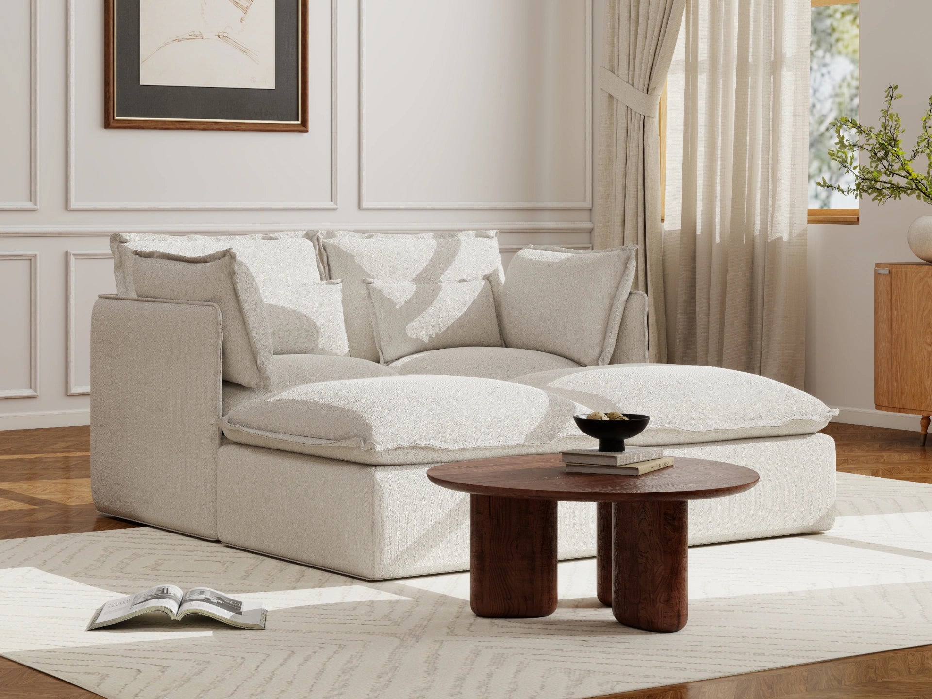 I originally got the 4 seater, I’ve since added two more seats and 2 ottomans. I have 2 toddlers and a dog (and a tradie) AND the white version and I am super impressed with the way it spot cleans. I’ve gotten pen, raspberry and chocolate off without having to wash it in the machine. The pillows get softer everytime we sit on it and it’s firm enough that it has decent support in the back. I hope they bring out more colours! Maybe boucle grey?? Or a chocolate! It has not disappointed me yet!