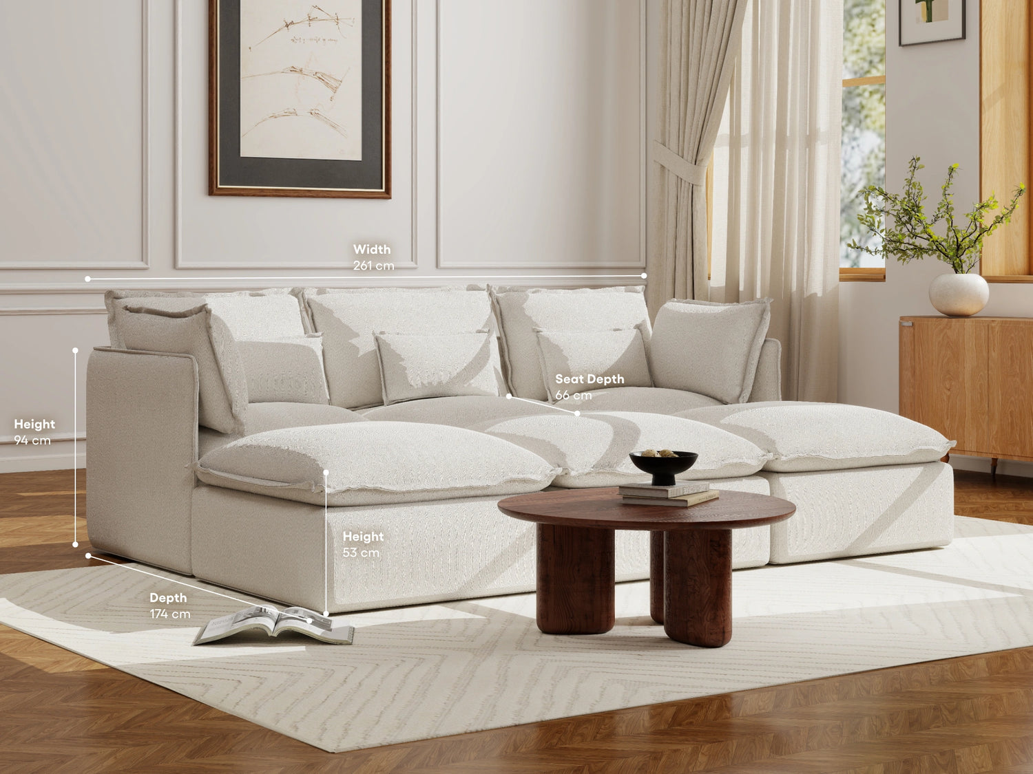 I originally got the 4 seater, I’ve since added two more seats and 2 ottomans. I have 2 toddlers and a dog (and a tradie) AND the white version and I am super impressed with the way it spot cleans. I’ve gotten pen, raspberry and chocolate off without having to wash it in the machine. The pillows get softer everytime we sit on it and it’s firm enough that it has decent support in the back. I hope they bring out more colours! Maybe boucle grey?? Or a chocolate! It has not disappointed me yet!