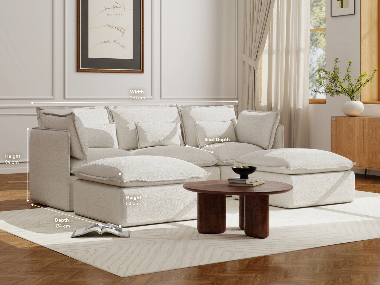 I originally got the 4 seater, I’ve since added two more seats and 2 ottomans. I have 2 toddlers and a dog (and a tradie) AND the white version and I am super impressed with the way it spot cleans. I’ve gotten pen, raspberry and chocolate off without having to wash it in the machine. The pillows get softer everytime we sit on it and it’s firm enough that it has decent support in the back. I hope they bring out more colours! Maybe boucle grey?? Or a chocolate! It has not disappointed me yet!