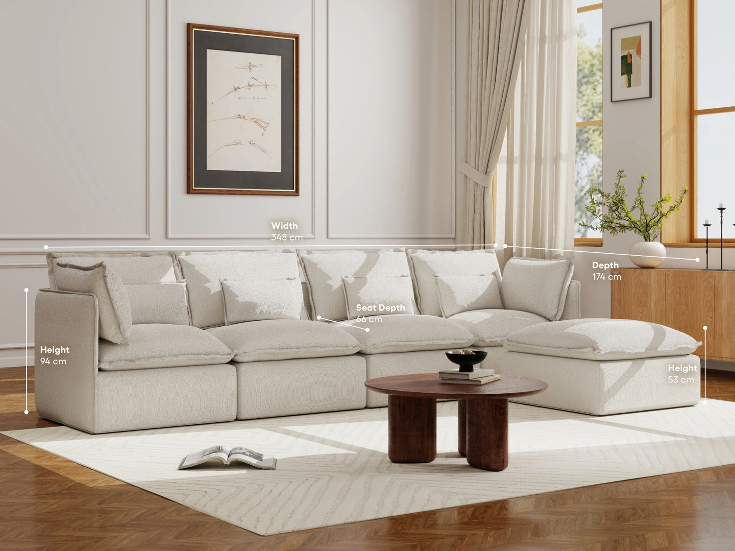 I originally got the 4 seater, I’ve since added two more seats and 2 ottomans. I have 2 toddlers and a dog (and a tradie) AND the white version and I am super impressed with the way it spot cleans. I’ve gotten pen, raspberry and chocolate off without having to wash it in the machine. The pillows get softer everytime we sit on it and it’s firm enough that it has decent support in the back. I hope they bring out more colours! Maybe boucle grey?? Or a chocolate! It has not disappointed me yet!
