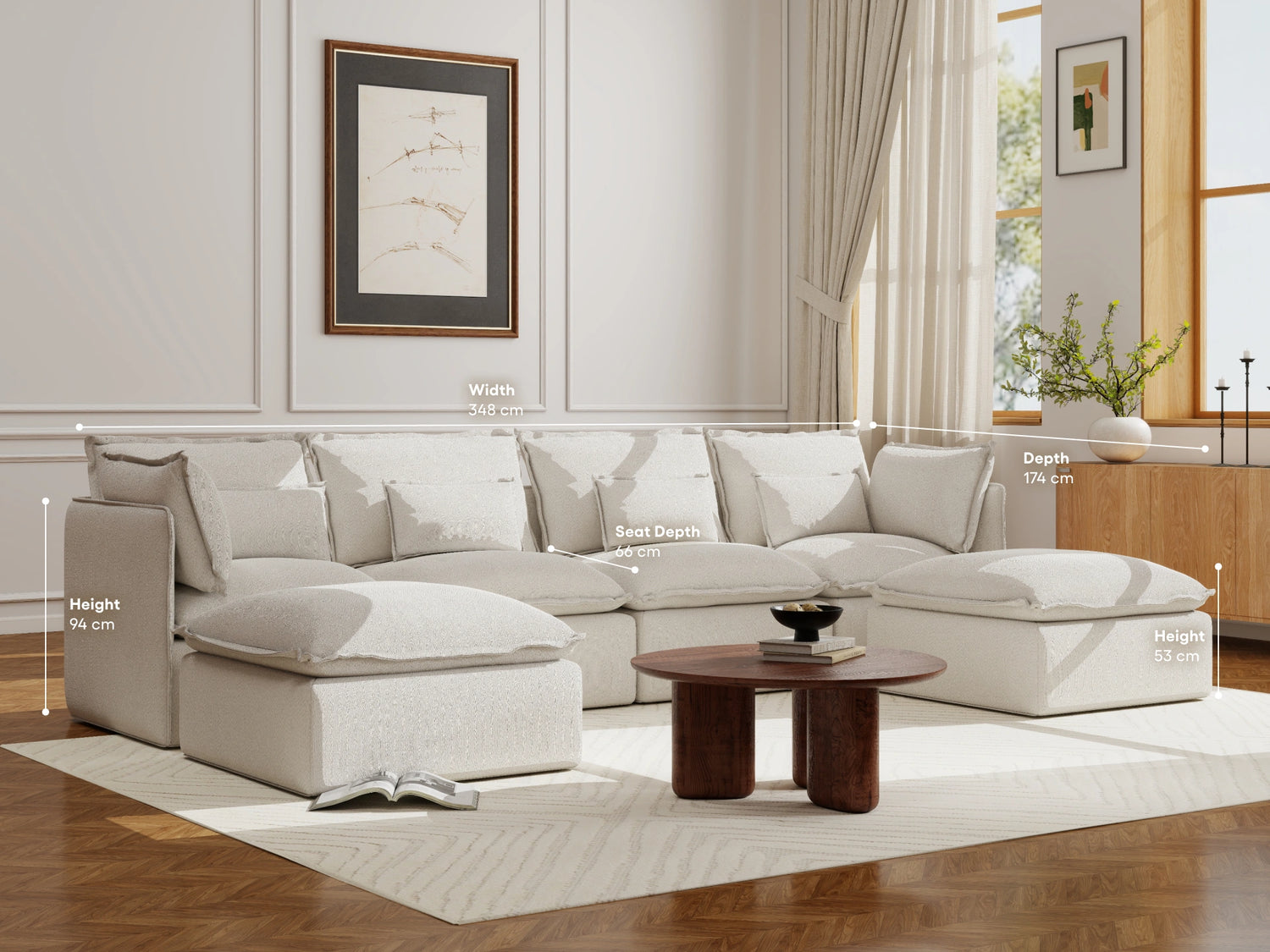 I originally got the 4 seater, I’ve since added two more seats and 2 ottomans. I have 2 toddlers and a dog (and a tradie) AND the white version and I am super impressed with the way it spot cleans. I’ve gotten pen, raspberry and chocolate off without having to wash it in the machine. The pillows get softer everytime we sit on it and it’s firm enough that it has decent support in the back. I hope they bring out more colours! Maybe boucle grey?? Or a chocolate! It has not disappointed me yet!