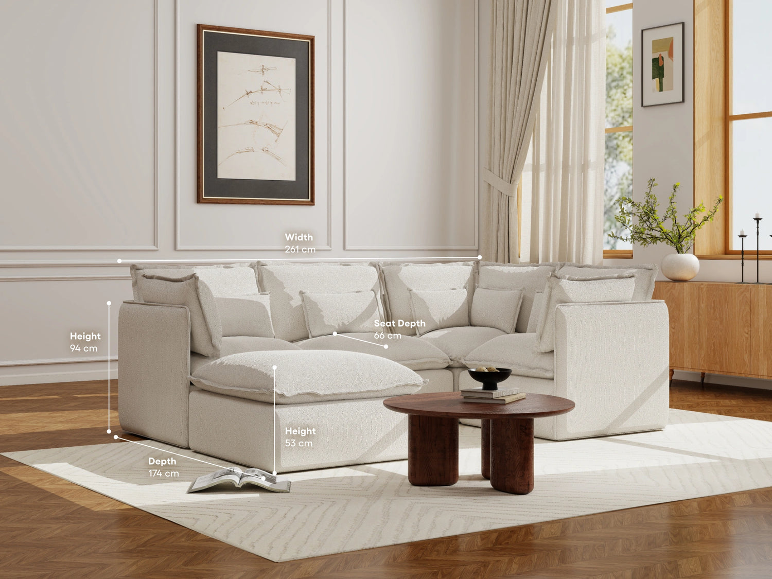 I originally got the 4 seater, I’ve since added two more seats and 2 ottomans. I have 2 toddlers and a dog (and a tradie) AND the white version and I am super impressed with the way it spot cleans. I’ve gotten pen, raspberry and chocolate off without having to wash it in the machine. The pillows get softer everytime we sit on it and it’s firm enough that it has decent support in the back. I hope they bring out more colours! Maybe boucle grey?? Or a chocolate! It has not disappointed me yet!