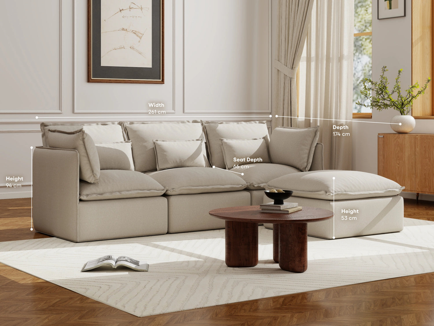 I originally got the 4 seater, I’ve since added two more seats and 2 ottomans. I have 2 toddlers and a dog (and a tradie) AND the white version and I am super impressed with the way it spot cleans. I’ve gotten pen, raspberry and chocolate off without having to wash it in the machine. The pillows get softer everytime we sit on it and it’s firm enough that it has decent support in the back. I hope they bring out more colours! Maybe boucle grey?? Or a chocolate! It has not disappointed me yet!